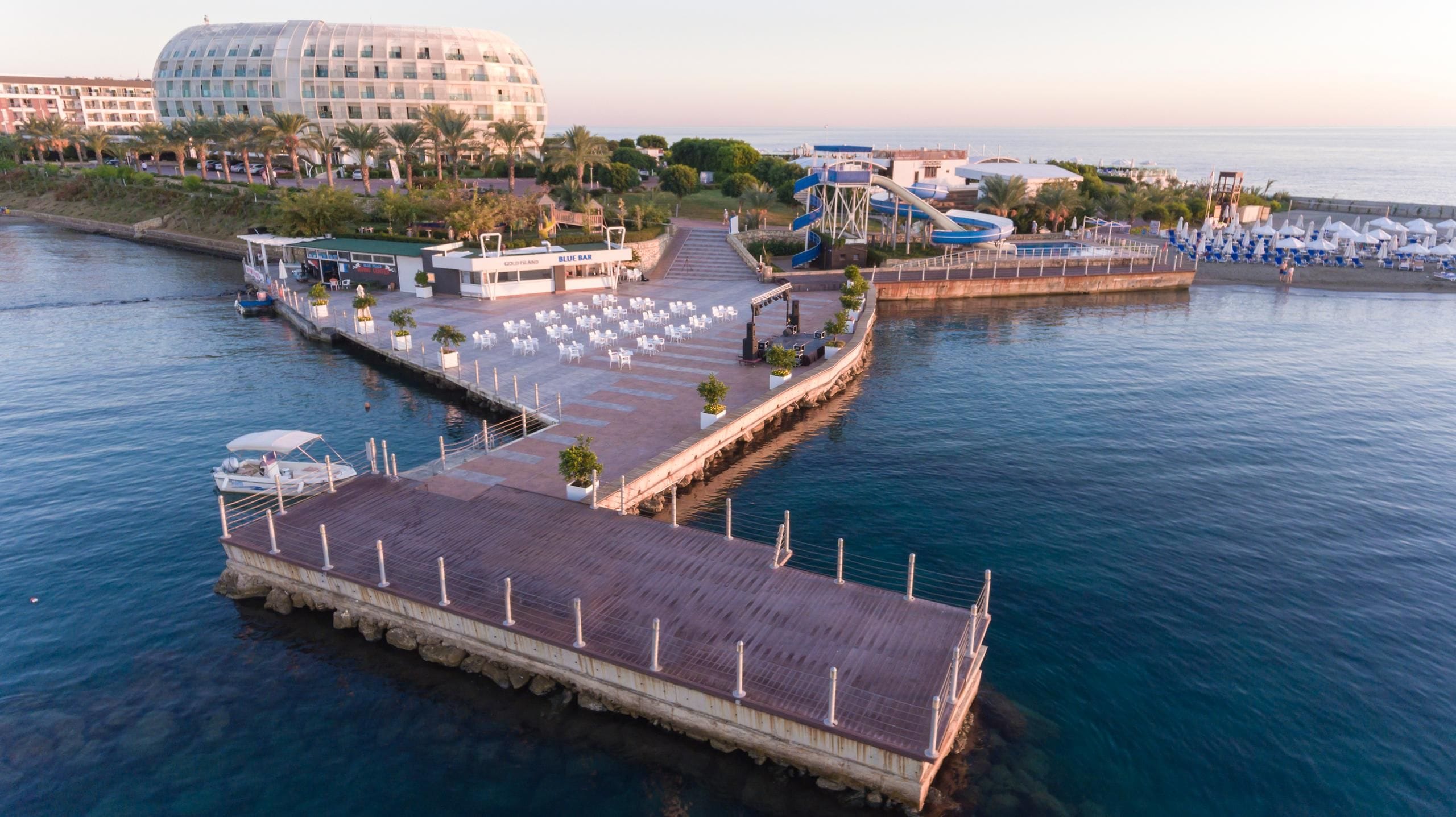 Aquapark 10.00-12.30 ve 14.00-17.00 saatleri arasında hizmet veriyor. Aquapark mevcut. Gold Island Selected bünyesinde 3 adet su kaydırağı, Gold Island Family’de ise 5 adet su kaydırağı bulunuyor.