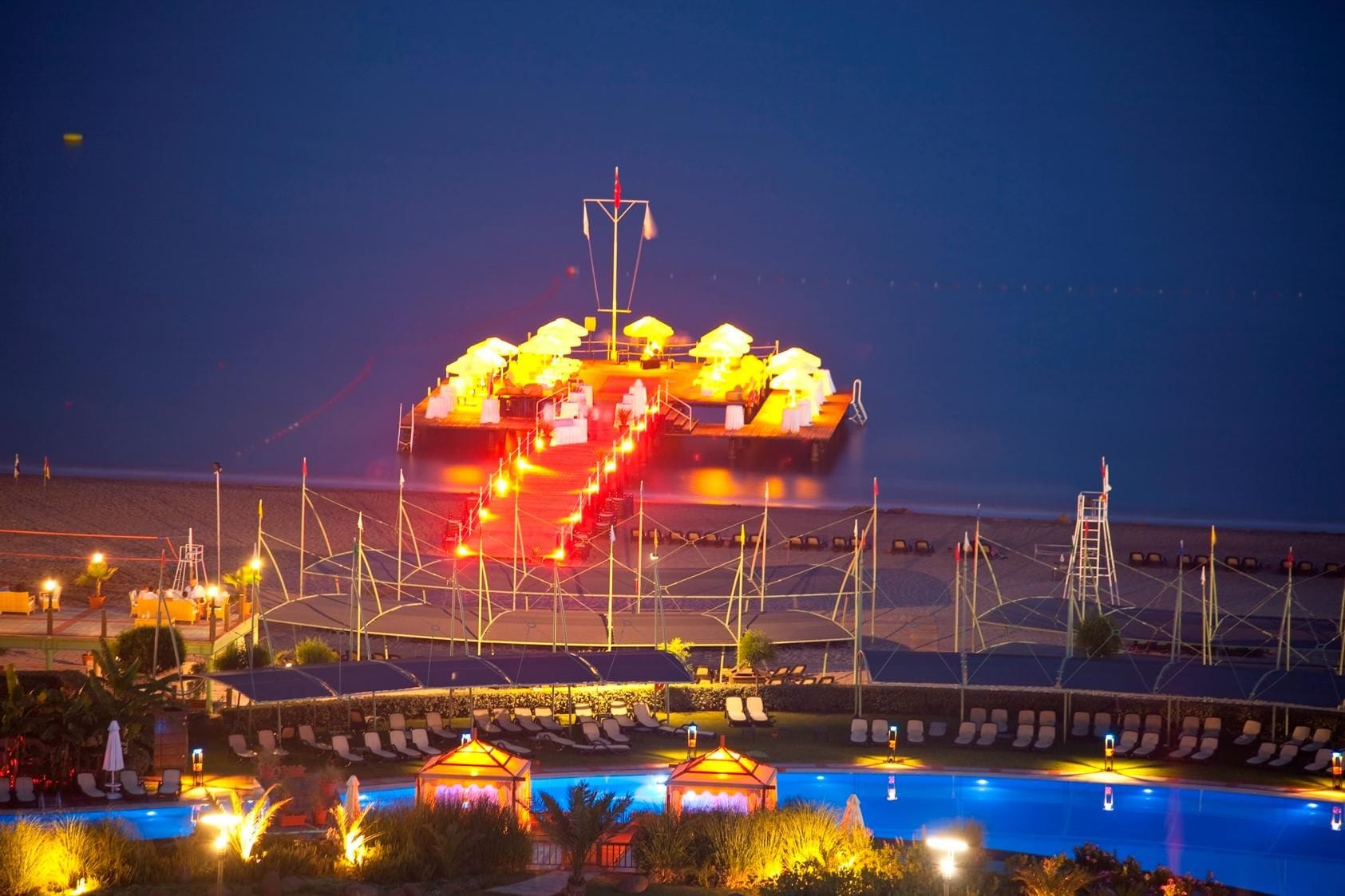 Havuz ve iskelede şemşiye, plajda gölgelik bulunuyor.
